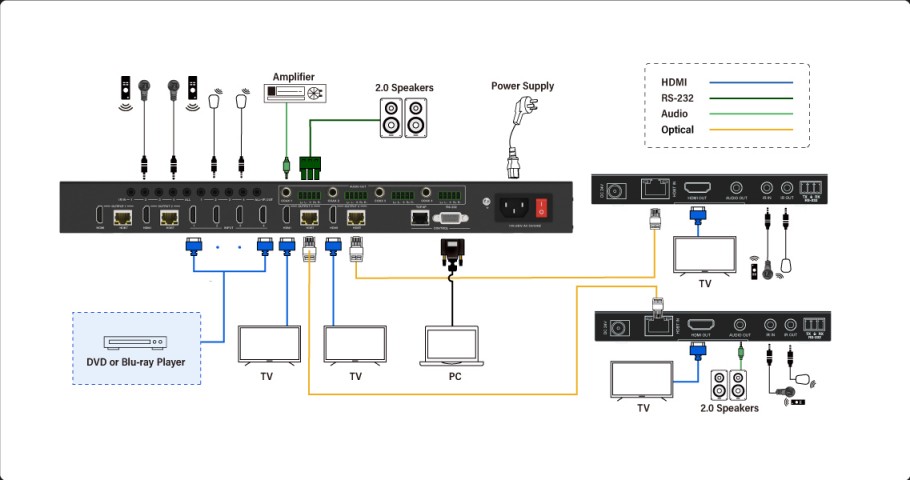 - ส่งสัญญาณไปยังพอร์ต Output ที่เชื่อมต่อกับจอ หรือผ่าน Extender (เช่น HDBaseT สำหรับระยะไกล)